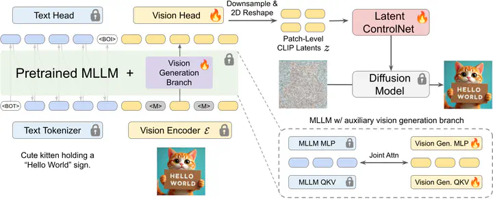 There is growing interest in integrating high-fidelity visual synthesis capabilities into large language models (LLMs) without compromising their strong reasoning capabilities. Existing methods that directly train LLMs or bridge LLMs and diffusion models usually suffer from costly training since the backbone LLMs have not seen image representations during pretraining. We present Bifrost-1, a unified framework that bridges pretrained multimodal LLMs (MLLMs) and diffusion models using patch-level CLIP image embeddings as latent variables, which are natively aligned with the MLLM’s CLIP visual encoder. These patch-level image embeddings are integrated into the diffusion model with a lightweight adaptation of its ControlNet. To retain the original multimodal reasoning capabilities of MLLMs, we equip the MLLM with a visual generation branch initialized from the original MLLM parameters when predicting the patch-level image embeddings. By seamlessly integrating pretrained MLLMs and diffusion models with patch-level CLIP latents, our framework enables high-fidelity controllable image generation with significant training efficiency. Our experiments demonstrate that Bifrost-1 achieves comparable or better performance than previous methods in terms of visual fidelity and multimodal understanding, with substantially lower compute during training. We also provide comprehensive ablation studies showing the effectiveness of our design choices.