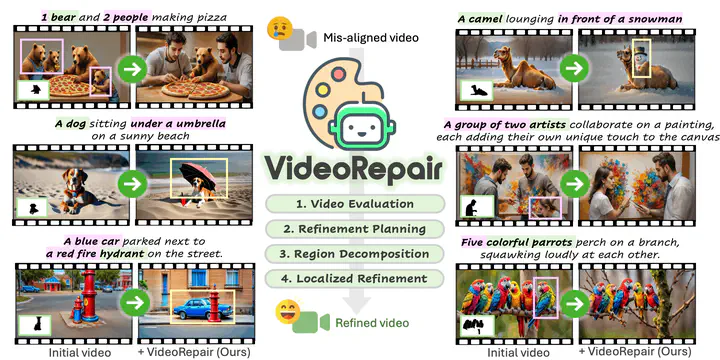 Recent text-to-video (T2V) diffusion models have made remarkable progress in generating high-quality videos. However, they often struggle to align with complex text prompts, particularly when multiple objects, attributes, or spatial relations are specified. We introduce VideoRepair, the first self-correcting, training-free, and model-agnostic video refinement framework that automatically detects fine- grained text–video misalignments and performs targeted, localized corrections. Our key insight is that even misaligned videos usually contain correctly generated regions that should be preserved rather than regenerated. Building on this observation, VideoRepair proposes a novel region-preserving refinement strategy with three stages: (i) misalignment detection, where MLLM-based evaluation with automatically generated evaluation questions identifies misaligned regions; (ii) refinement planning, which preserves correctly generated entities, segments their regions across frames, and constructs targeted prompts for misaligned areas; and (iii) localized refinement, which selectively regenerates problematic regions while preserving faithful content through joint optimization of preserved and newly generated areas. On two benchmarks, EvalCrafter and T2V-CompBench with four recent T2V backbones, VideoRepair achieves substantial improvements over recent baselines across diverse alignment metrics. Comprehensive ablations further demonstrate the efficiency, robustness, and interpretability of our framework.